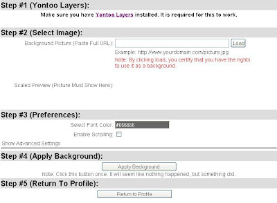lahkah #4(apply background).dengan meng klik "aplly Background" artinya memasang layout tsb ke FB loe.lahkah#5(returun to profile).dengan meng klik menu tsb loe akan diarahkan ke profile FB loe dan tinggal liat hasilnya.tunggu prosesnya(untuk lebih maksimal silahkan reload/refresh firefox/internet explorer loe bebarapa kali bisa juga log out dan log in kmbli).thats it!!!selamat mencoba dan jangan lupa invite semua temen - temen FB loe buwat install YONTOO LAYERS dan pake layout di Full Page FACEBOOK LAYOUT biar temen - temen loe juga bisa liat layout FB loe yang kuwreen ntu!!